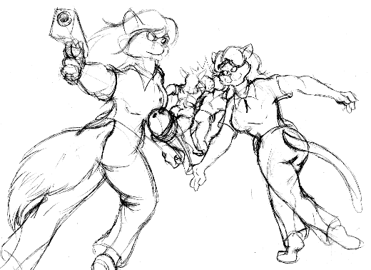 15 July, 1997 This is an action sketch from a story concept I call 'Guns, Girls and Gold,' featuring Tammy, Vicki, and that's Ruby Godeschke in the background walloping some poor schmuck who had the ill fortune to get in their way. A little hard to see it, I know. You should have seen how much I had to reduce this one.
