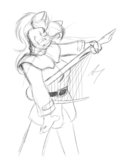 7 August, 1997 Eight different sketches today, and this was the best of the bunch, oi! but it's been an off night. Just a rough of Tammy in one of her Bremen Bulldozer outfits, wailin' away. The instrument (I've called it a 'fishbone kitar' on occasion) is due for a rework, but will look no less oddball. If anything, it may get even worse. *heh!*